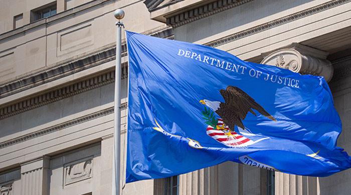 The image shows the flag of Department of Justice fluttering at its building. — DOJ/File