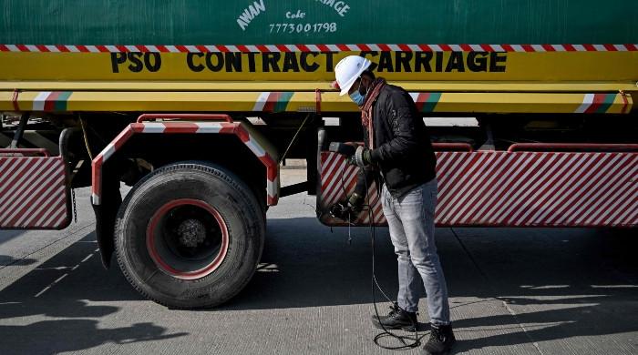 This picture taken on December 10, 2025, shows technician Waleed Ahmed examining a vehicle to test its emissions on road, on the outskirts of Islamabad. — AFP