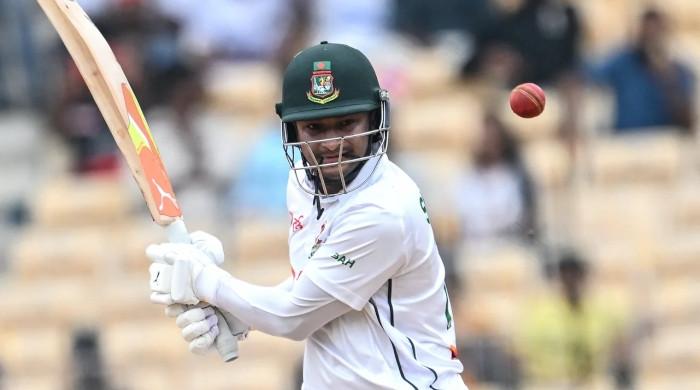 Shakib Al Hasan batting while biting a strap, India vs Bangladesh, 1st Test, 4th day, Chennai, September 22, 2024. — AFP