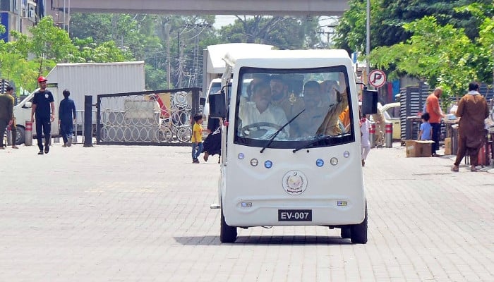 A family ridding electric shuttle service at Saddar area in Rawalpindi, September 14, 2026. — Online